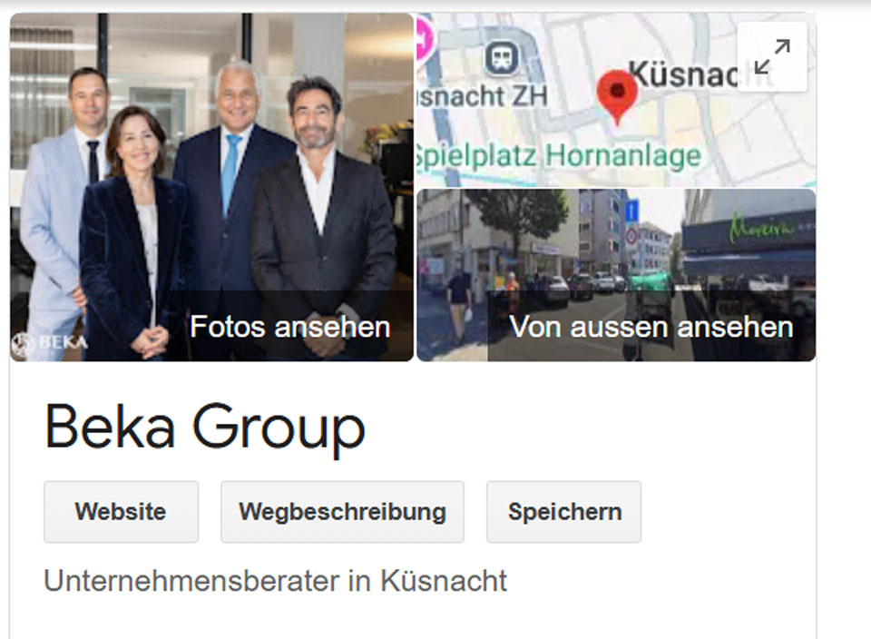 So setzt die BEKA Group nicht ausschliesslich auf eine Webseite, sondern erstellte mit unserer Hilfe ein Google Unternehmenskonto, welches wir mit relevanten Inhalten gefüllt haben und in einfachem Umfang pflegen.